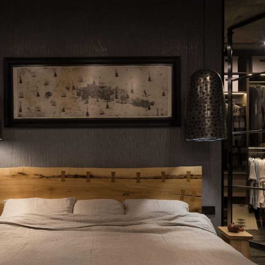 Маленькие светильники в на 3D панели гармонично дополняют интерьер спальни