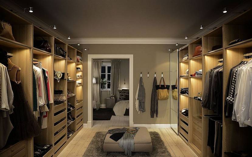 Осветительные приборы монтируют по всему периметру потолка. Точечные виды или поворотные споты равномерно осветят все пространство. Чтобы маленькая гардеробная из кладовки выглядела уютной, используют модели на подвесках (кронштейнах). Полки подсвечивают диодной лентой или накладными светильниками.