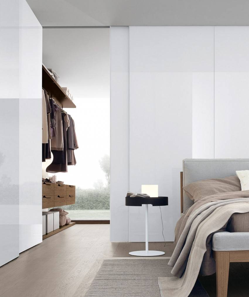Благодаря такому шкафу спальня обретает мягкие черты за счет скрывания угла и изогнутого фасада, что, в свою очередь, делает ее более уютной.