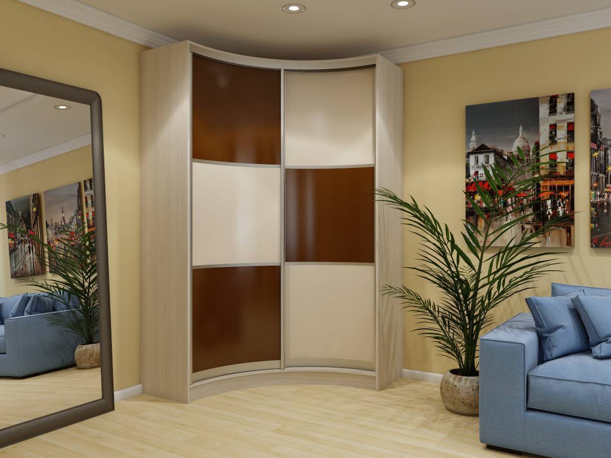Радиусные шкафы славятся необычным дизайном и достаточной вместимостью, но стоимость таких моделей нельзя назвать доступной. Поэтому покупать его для небольшой комнаты также будет неразумно.