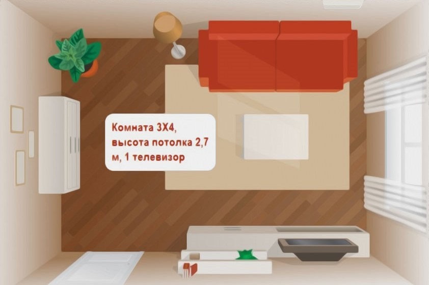 Рассчитаем по формуле охлаждающую мощность кондиционера для комнаты площадью 12 м² с высотой потолков 2,7 м в которой проживает один человек, а также есть телевизор. Комната расположена на солнечной стороне.