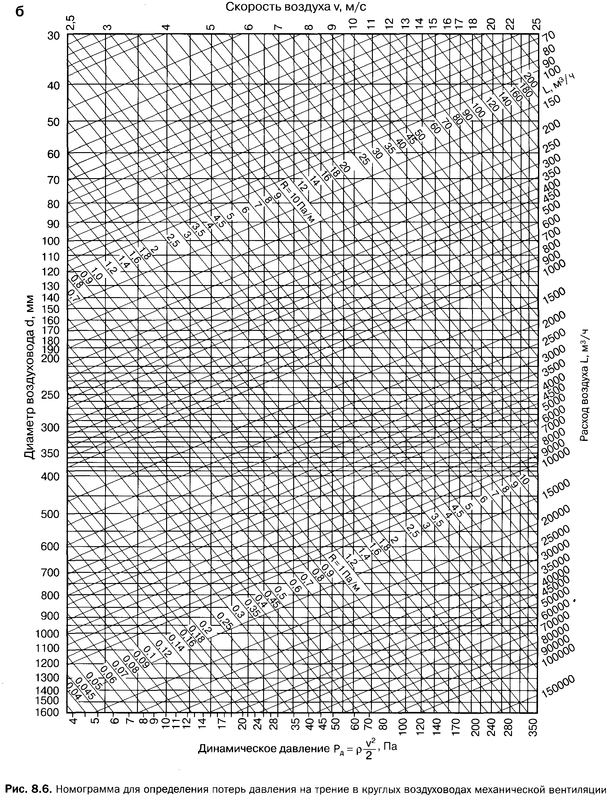 В принципе, можно не использовать номограмму, а найти требуемую площадь сечения, исходя из скорости воздуха. А площади подобрать по диаметру или ширине и длине прямоугольного сечения.