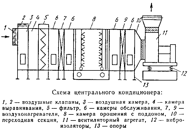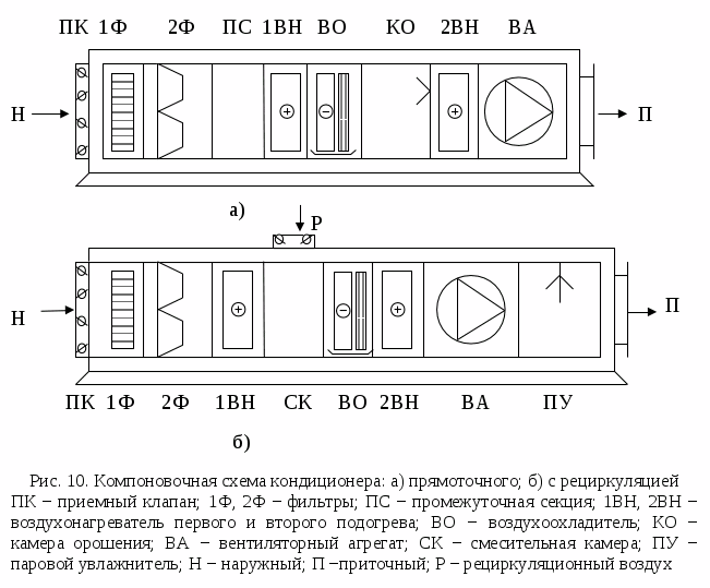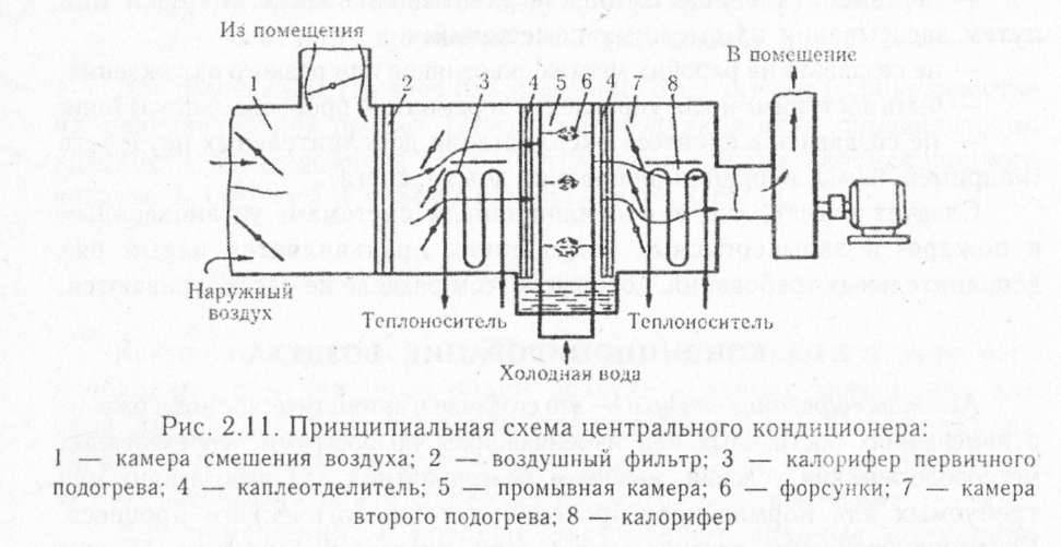- центральные установки кондиционирования с первой рециркуляцией. Свежий воздух смешивается с рециркуляционным до камеры орошения. Это уменьшает расходы на обогрев, охлаждение подаваемого воздухопритока;