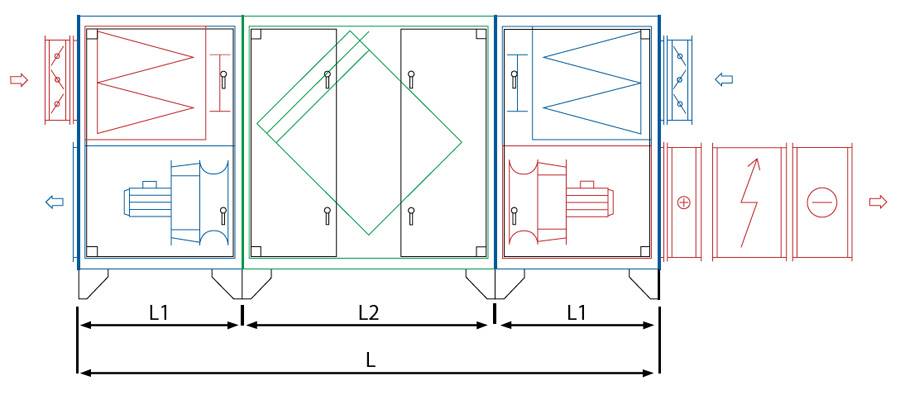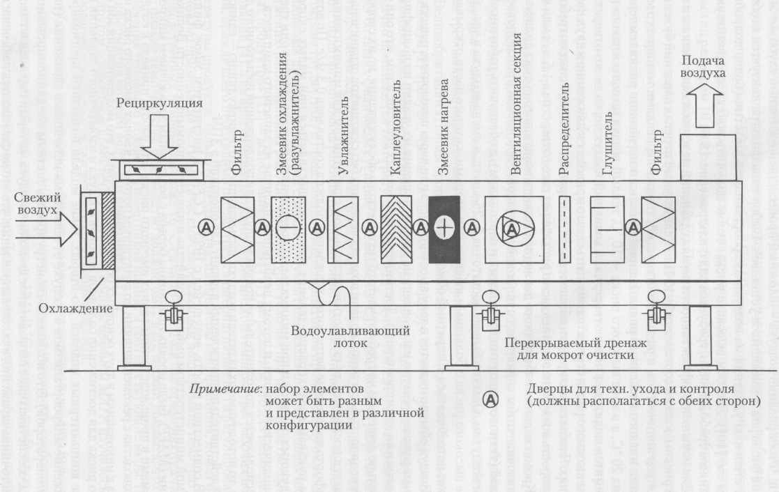 В общем корпусе центрального кондиционера размещены секции, исполняющие определенные функции. Их комплектация зависит от марки и типа оборудования. Стандартный набор модулей: