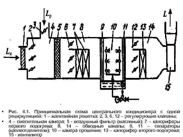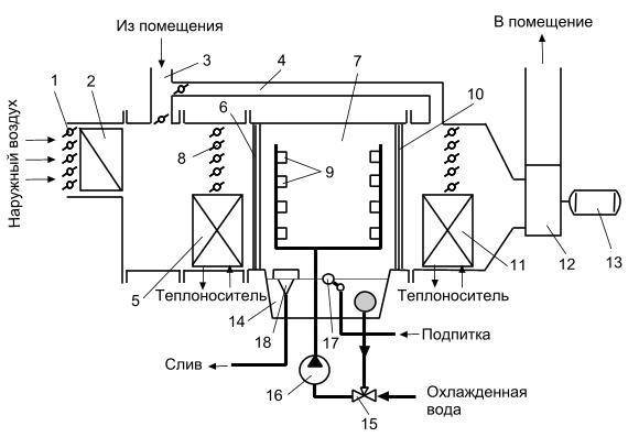 - центральные установки кондиционирования со второй рециркуляцией. Добавление уличного потока к рециркуляционному после камеры орошения.
