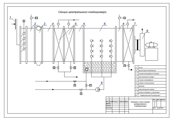 - Секция вентиляторов. Назначение – обеспечение забора атмосферного воздуха и подача в кондиционируемые зоны. Используются приборы центробежного типа.