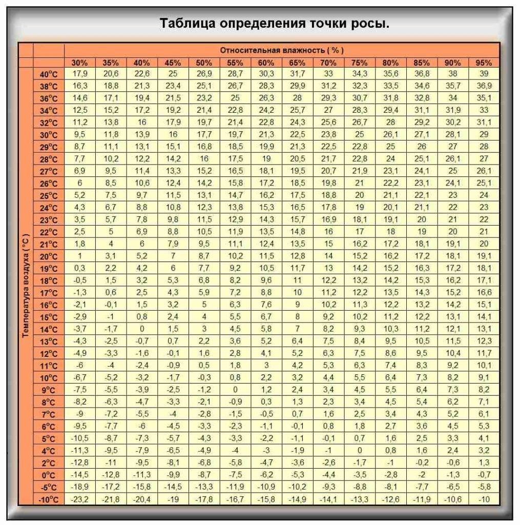 Таблица определения точки росы в зависимости от температуры воздуха и влажности.