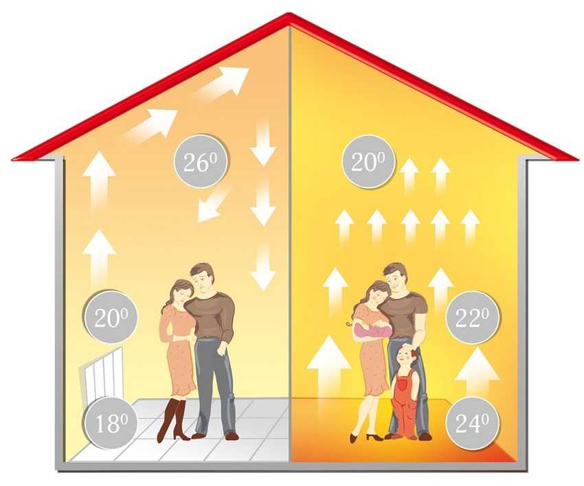При нагреве температуры помещения на 1 градус, тепло от поверхности пола передается воздуху: