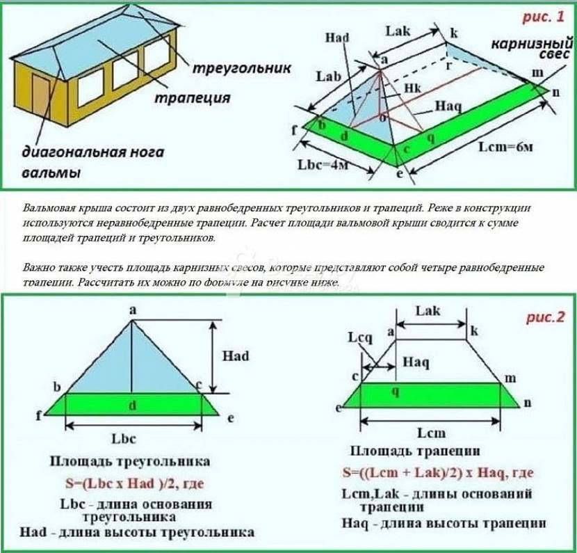 Для расчета площади сторон крыши применяются стандартные геометрические формулы