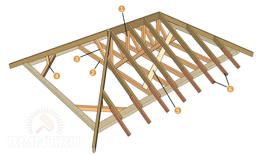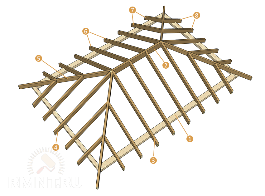 Наиболее характерный элемент вальмовой крыши – стропильная система. Она состоит из элементов, показанных на иллюстрации.