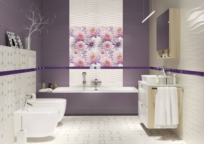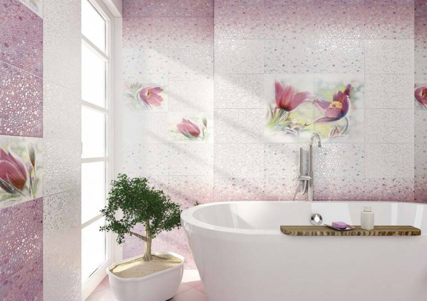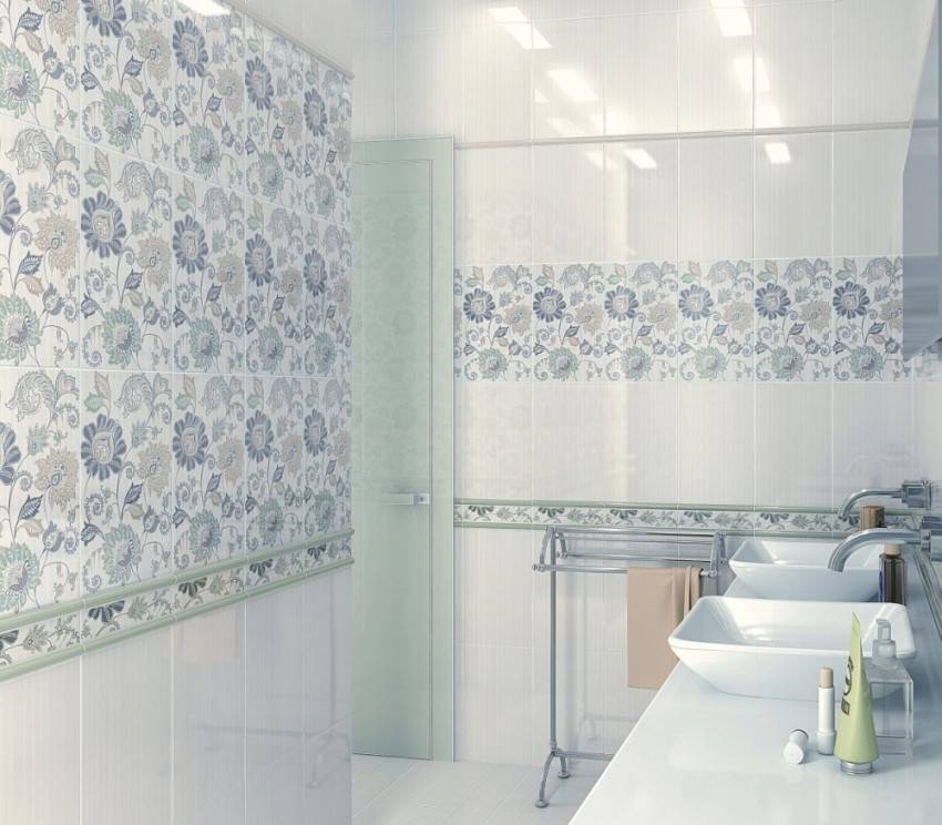 Последние тенденции в дизайне привели к тому, что большая часть кафельной плитки для ванных комнат делают однотонными. Многие коллекции отличаются интересной фактурой, но выполнены в виде однотонных фрагментов. Не всем такое оформление приходится по вкусу — слишком «холодным» получается интерьер. Добавить фантазийности можно при помощи плитки с цветами или бабочками, растительными или геометрическими мотивами.