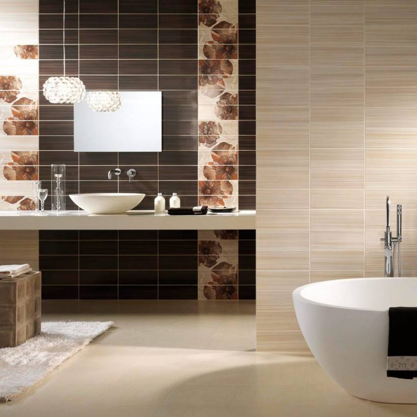 Чаще комбинируют не два, а три вида кафеля: два однотонных и декор, сочетающий оба основных цвета. Декоративные элементы могут быть разной ширины. Тогда из них можно составить полосы или колонны разной ширины. Чтобы верхняя часть не была столь монотонной и скучной добавляют тонкие полоски того же цвета, что и нижняя часть стены, а внизу добавляют растительный или цветочный бордюр.