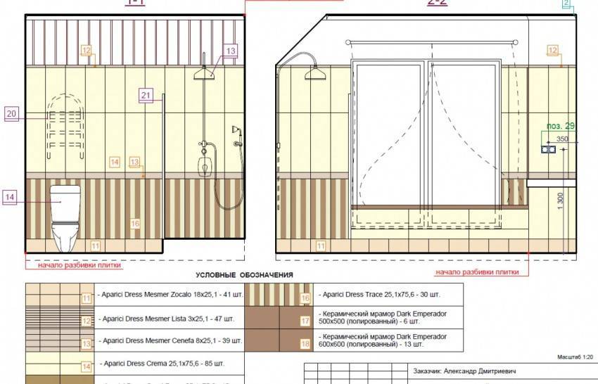 - В душевой применяется вышеуказанная раскладка по всей протяженности помещения. В ванной мы применяем такую раскладку на видимом участке между стеной и экраном ванной. После установки ванной все, что за экраном, скрывается, поэтому допускается применение узкого подреза под ванной.