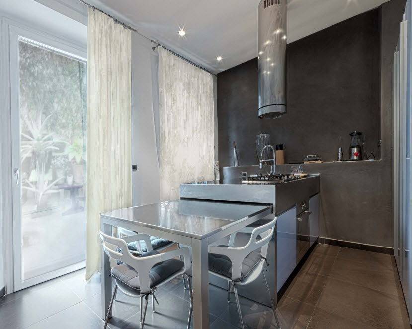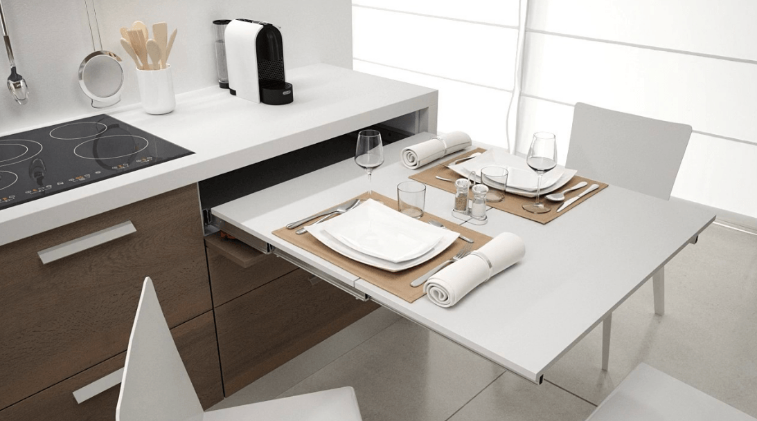 Еще одной компактной моделью является выдвижная столешница. Изделие встроено в кухонную мебель и в собранном виде имеет вид ящика. Выдвижная модель подходит для размещения пары человек. Для комфорта ширина изделия должна составлять 70 см. Такой вариант отлично подойдет для маленького помещения.
