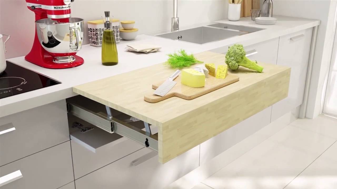 Для создания механизма выдвижения понадобятся два набора обычных направляющих полного выката, которые используются при изготовлении выдвижных ящиков. Длина дополнительных элементов равняется ширине основной столешницы. Их ширина устанавливается в зависимости от выдвижения. В конструкции может присутствовать от одного до трех элементов по усмотрению создателя.