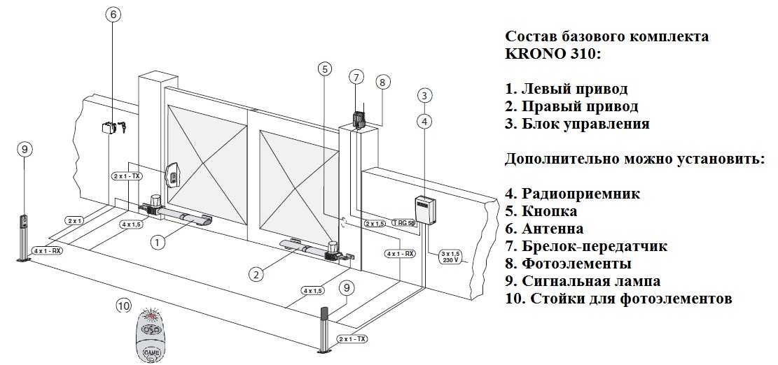 При установке готового комплекта для автоматических распашных ворот потребуется выполнить установку дополнительных датчиков и управляющих устройств. Кроме приводных толкателей, потребуется смонтировать согласно приведенной схеме: