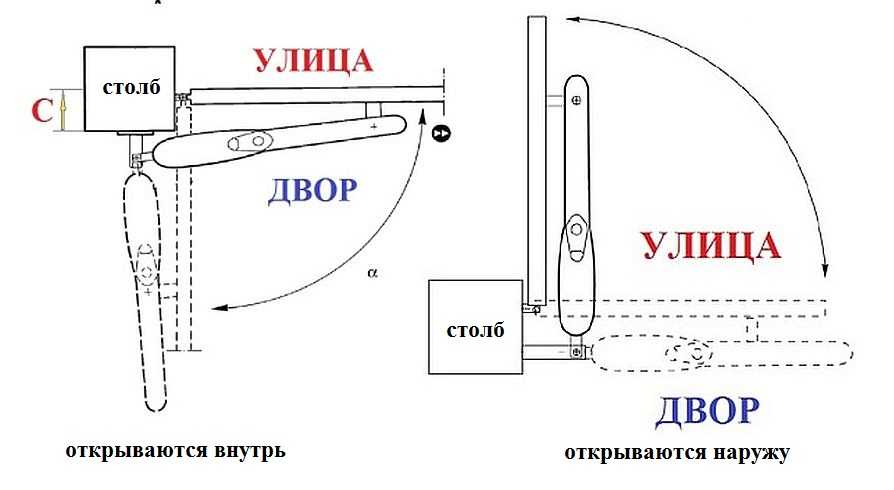Схемы установки линейного механизма открывания ворот внутрь и наружу