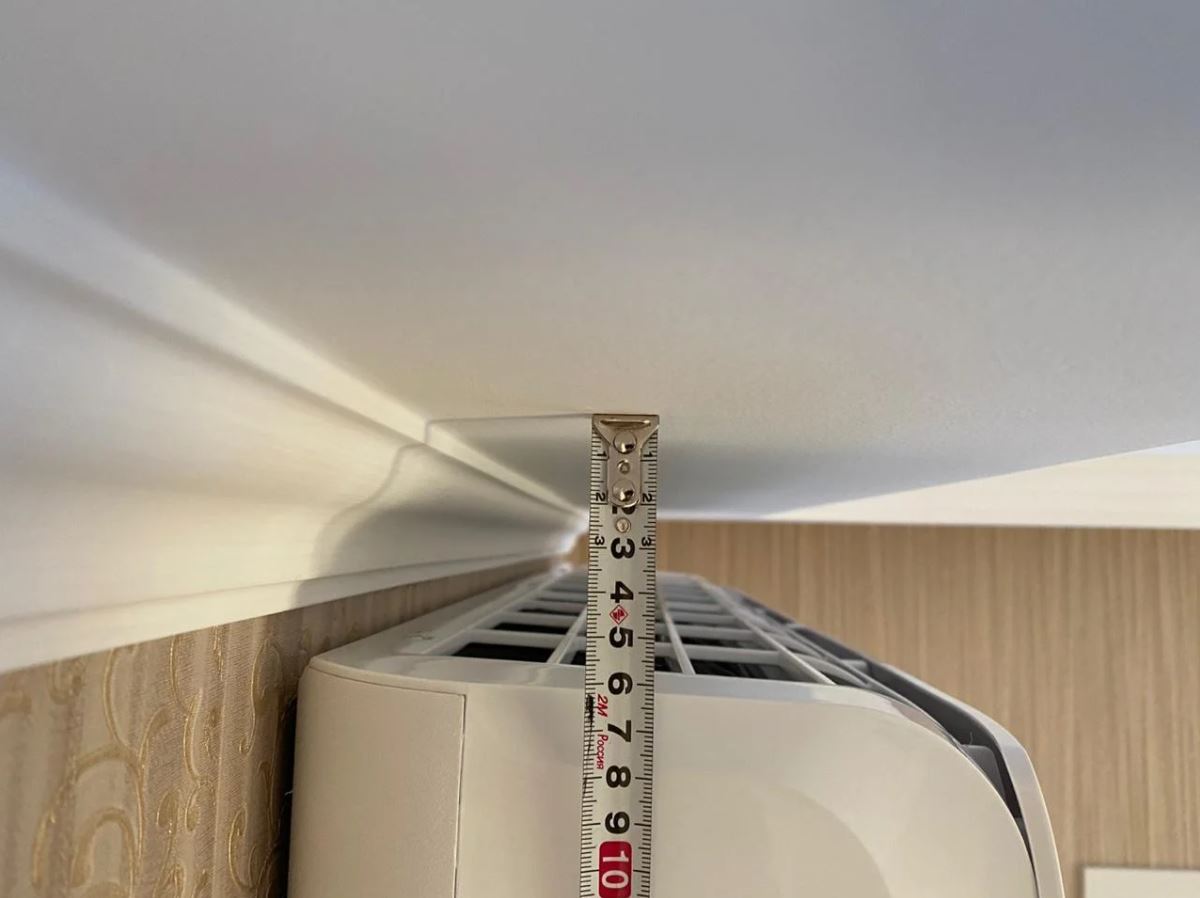 Оптимальное расстояние от кондиционеров до потолка нужно рассчитывать индивидуально, исходя из высоты ЧИСТОВОГО потолка, ширины плинтуса/багета, мощности и размеров настенного блока. Как вы понимаете, в таких условиях трубно выявить универсальное значение, которое подойдет для большинства заказчиков.