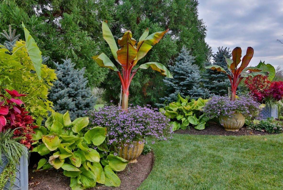 Хосты неплохо смотрятся в гармонии бордовых растений. Временно с ними могут высаживать бегонии или даже календулу. Особенно привлекательным будет оформление, если рядом с одним из сортов хосты посадить крупнолистовые декоративные культуры.