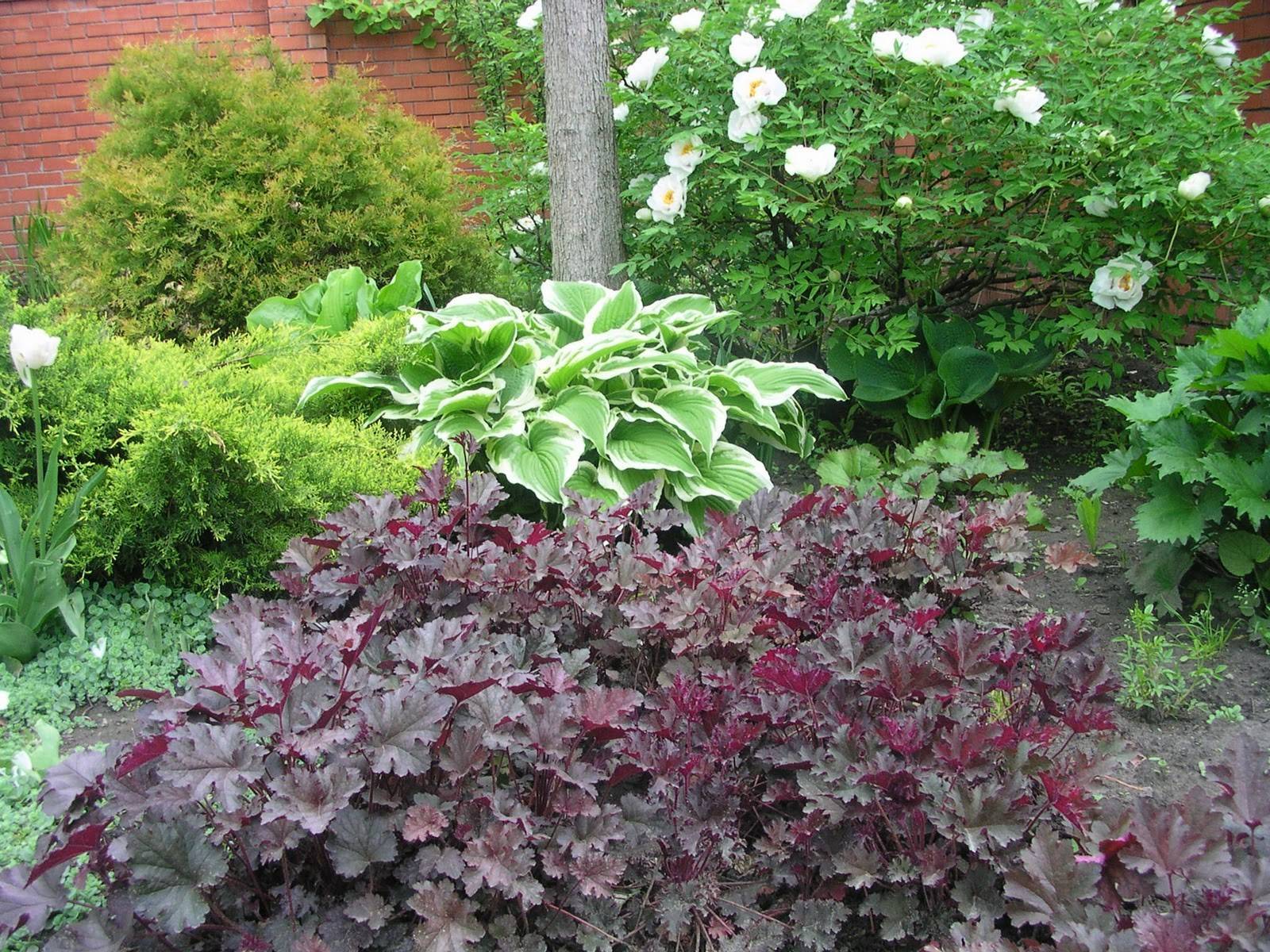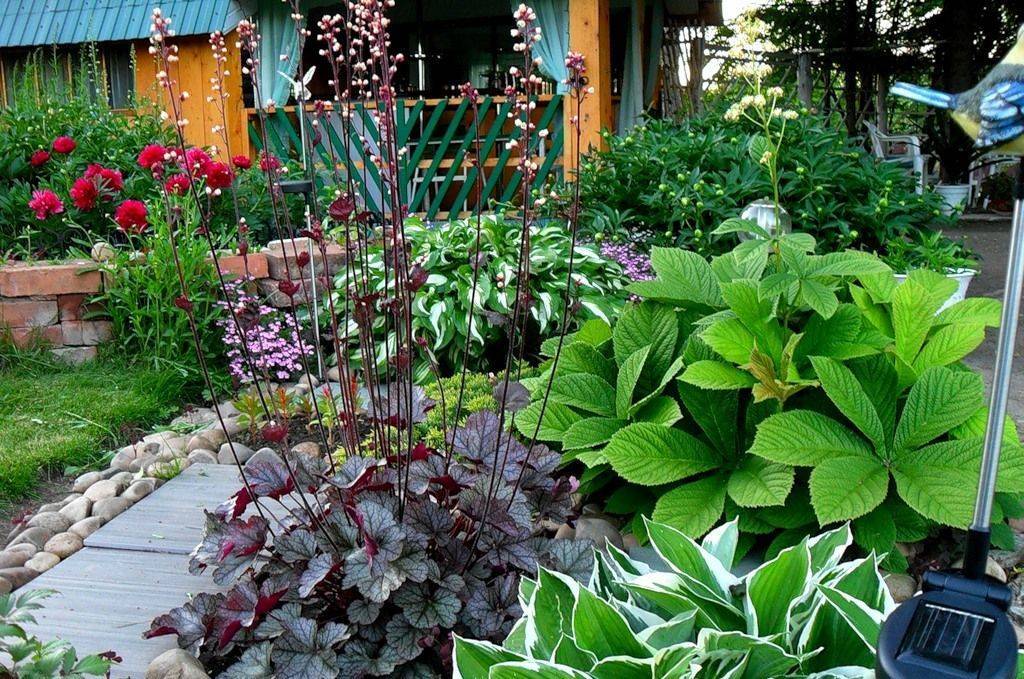 Гейхеры и хосты на клумбеИсточник moyadachya.ru