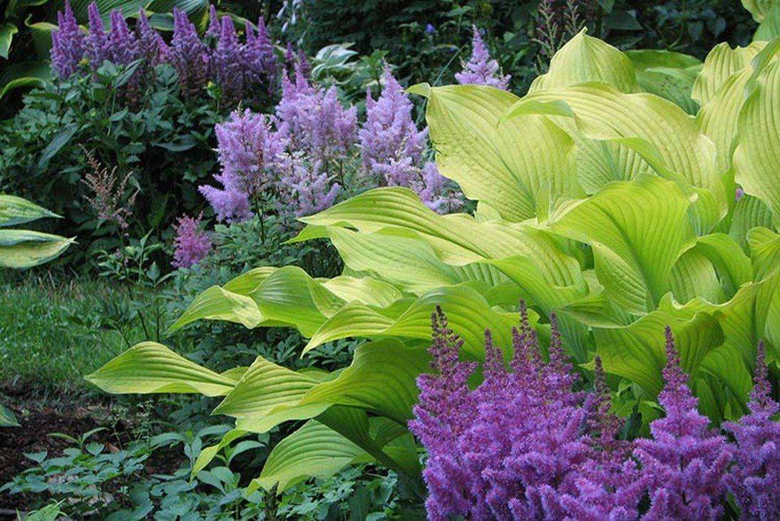 Создать яркий цветник можно и с другими растениями. К примеру, астильба со своим невероятно пышным и ароматным цветением определенно станет одним из самых подходящих вариантов. Только представьте, насколько прекрасно будут смотреться пышные, яркие кусты хосты в сочетании со столь прекрасными соцветиями. Такая композиция однозначно украсит ваш сад или приусадебную территорию. Кстати очень часто ее обрамляют каменной кладкой, что делает композицию еще более привлекательной.