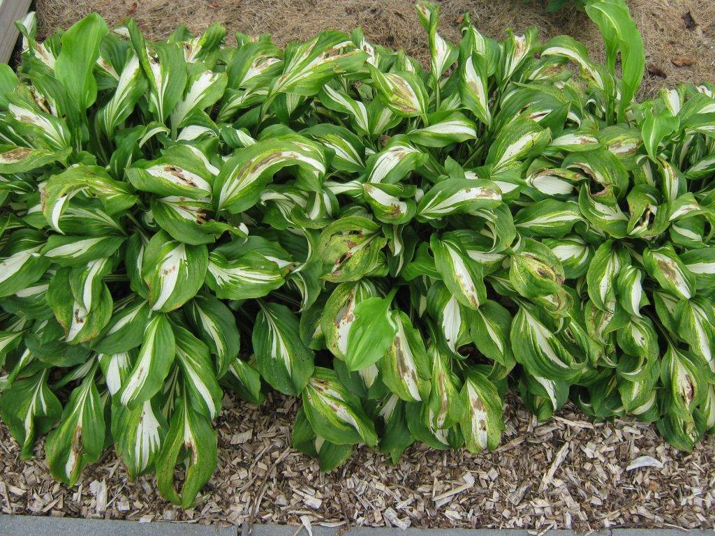 - волнистая хоста довольно высокая, но при этом достигает не более 75 см. Интересно, что ее листья имеют волнистый край, при этом зеленый окрас не равномерный, а больше напоминает хаотичные мазки. Посредине листочки белого цвета, что придает им особенно привлекательный внешний вид.