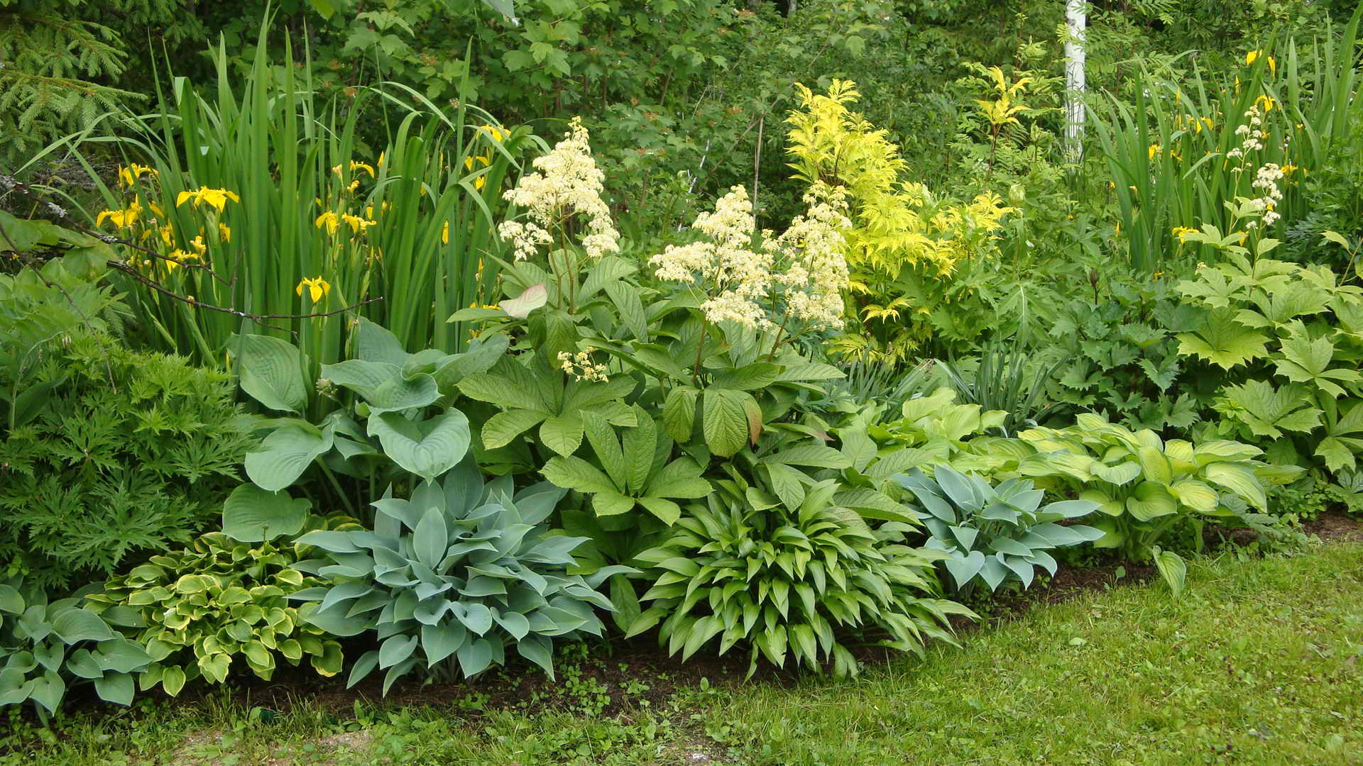 Вторым этапом следует высадка цветущих многолетников. Помня о ярусности, здесь можно свободно пофантазировать. Для прикрытия отросших стволов деревьев и кустарника подойдут ирис, высокий лилейник, герани, полемониум, базульник, астильба, многоколосники, кореопсисы, лаватеры, эхинацея. Для уравновешивания ярких цветов и придания дополнительного объёма композиции следует взять цинцинарию, хосту, гейхеру, артемизию. Природную натуральность цветнику придают при помощи злаковых: кореопсисы, многоколосники, ковыли, ожики, лагурус, гривастый ячмень.