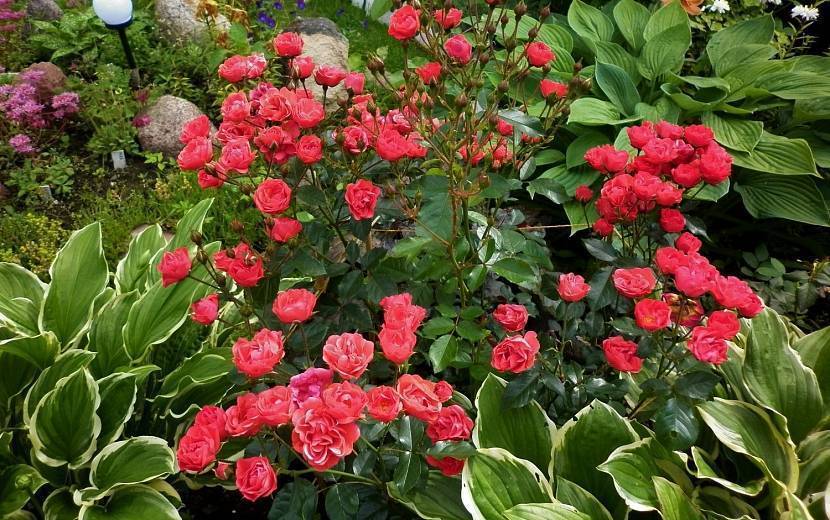 Оформление клумбы с розами и хостамиИсточник induced.info/