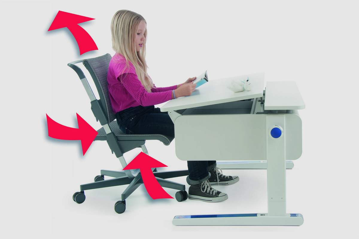 Регулируемый по высоте ортопедический стул для школьника позволяет устанавливать нужный промежуток от сиденья до пола и положение спинки, чтобы не было необходимости склоняться к столу. Подлокотники предназначены для удобства при занятиях, не связанных с работой руками (чтение, просмотр видео).