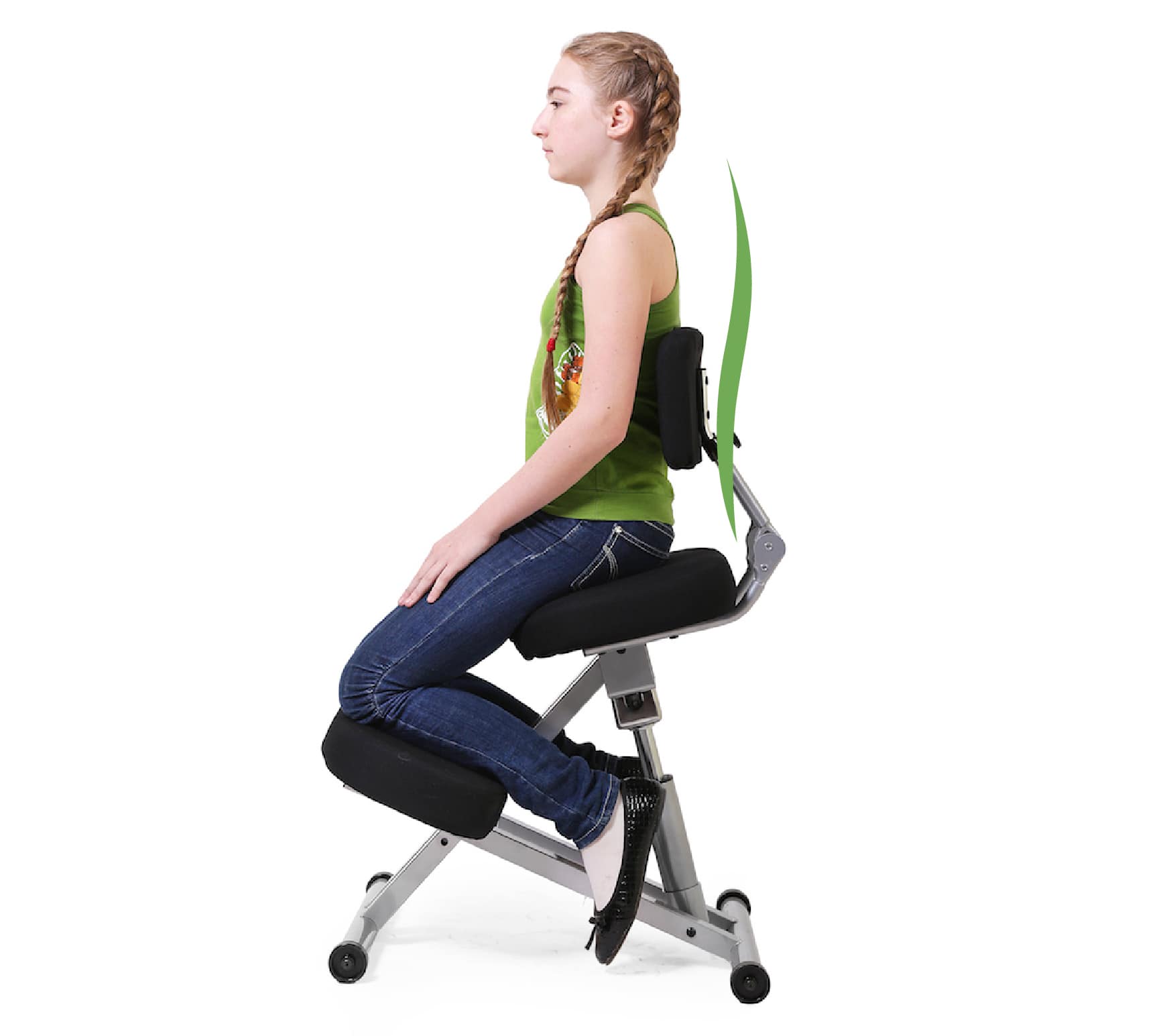 Кресло необычной конструкции, разработанный ортопедом. Многие дети после долгого сидения на стуле спускаются на край, чтобы опереться на колени. Благодаря такой конструкции центр тяжести смещается вперед. Корректируется под рост, колени и правильную посадку.