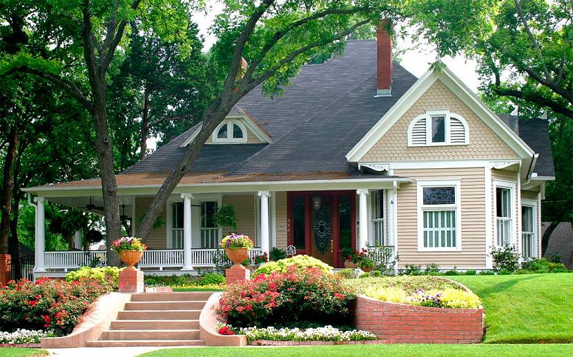 Чтобы добиться необходимого эффекта, можно прибегнуть к определенным дизайнерским решениям, которые помогут справиться с рядом недостатков и показать дом в наилучшем свете. Например, если перед жилищем находится газон, то цветы и кустарники предпочтительнее разместить рядом с домом, вдоль стен и перед входом. При этом на заднем плане хорошо будут смотреться вьющиеся растения, а перед ними лучше расположить цветы на клумбах. На крыльце можно дополнительно поставить вазоны с цветами.