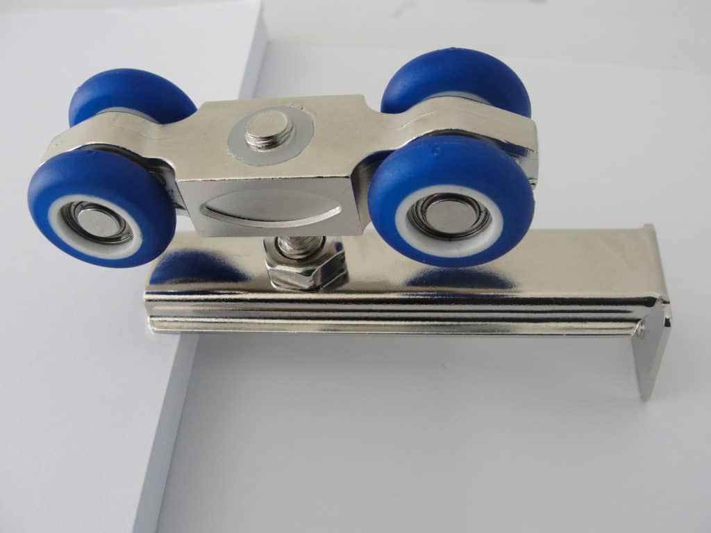 Устройства откатных дверей делятся на подвесные и рельсовые. В случае с подвесным механизмом ходовая часть, одна или несколько, устанавливаются только сверху конструкции, а внизу закрепляется дополнительный ролик, чтобы обеспечить легкое перемещение.