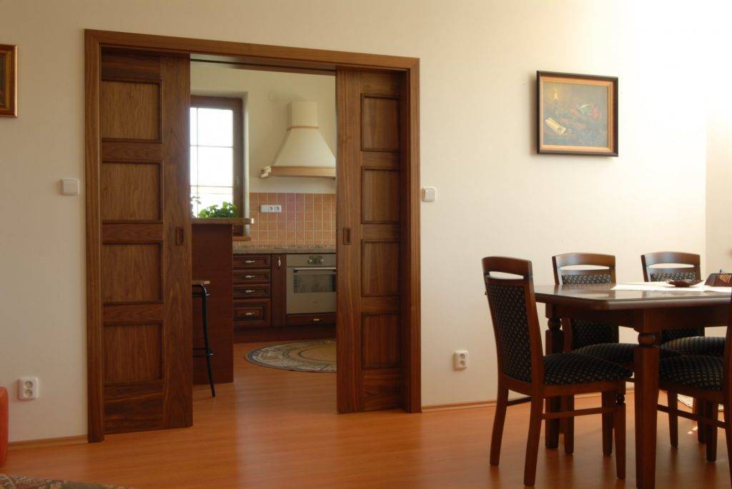 Они могут состоять из одной или двух створок. Работают они по единой схеме: двигаются вдоль вертикальной поверхности. Разница лишь в том, что у двустворчатых дверей полотна расходятся в разные стороны. Стоит отметить, что данная модель экономит пространство, украшает ваш интерьер. Она идеально подойдет для гостиной, детской, кухни, гардеробной.