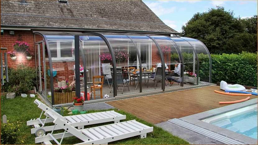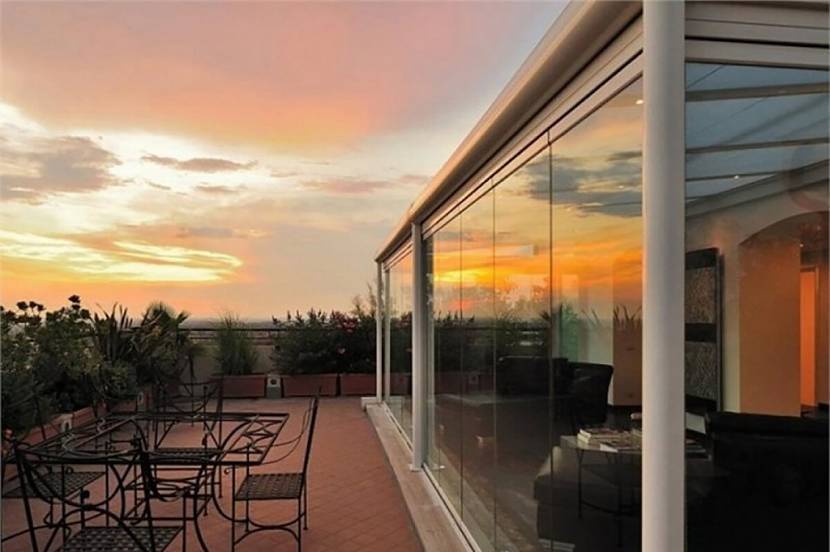 - Панорамная конструкция обеспечивает хорошую защиту от осадков, холода, шума. Не нужно переживать во время отдыха, что пойдет дождь и придется переносить продукты в дом. Пикник можно устраивать прямо на террасе, открыв широкие двери.
