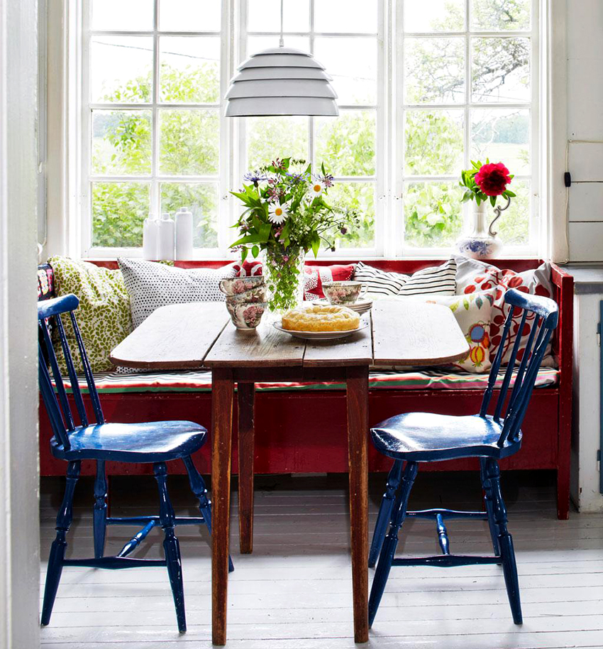 Идеально, когда цвет обеденного стола сочетается с общим интерьером кухни. Можно пойти другим путем, и подобрать стол, контрастирующий по оттенку с общей цветовой гаммой помещения