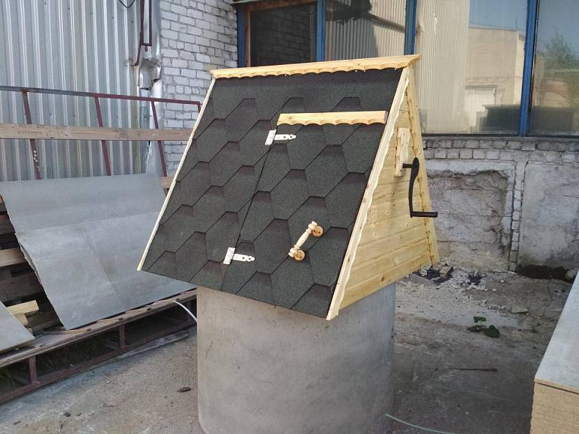 Чтобы обшить колодец деревом своими руками, вокруг бетонного кольца сколачивают каркас из бруса. Сразу предусматривают конструкцию крыши. Для такого колодца оптимально обустроить полноценную двускатную конструкцию с фронтонами. Для обслуживания скважины на одном скате устанавливают широкую дверцу.