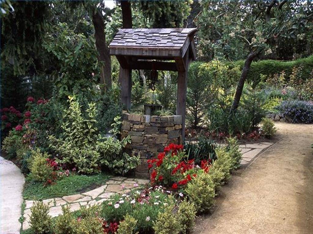 Хорошо смотрится декоративный колодец, вокруг которого посажена газонная трава, низкорослые кустарники, вьющиеся растения, как показано на фото