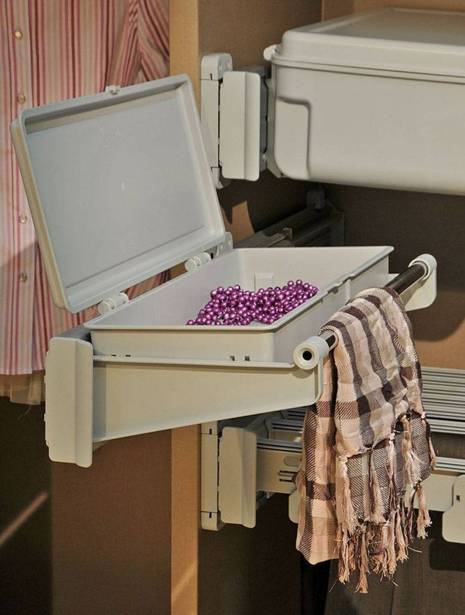 Планируя внутреннее обустройство, не забудьте про закрывающиеся ящики, в которых можно будет хранить перчатки, шапки, шарфики, носки, нижнее белье и прочее. Обустраивая небольшую гардеробную, лучше отдать предпочтение не выдвижным, а выкатывающимся ящикам. Их преимущество в том, что вещи, которые в них хранятся, всегда видно, поэтому найти ту или иную не составит труда.