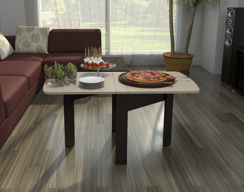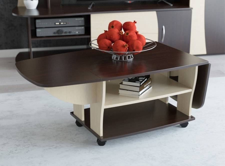 Интересный вариант для гостиной или спальни – журнальный стол-книжка. Особенностью таких изделий являются меньшие размеры и габариты в целом (высота – от 50 см, ширина – около 60 см, а глубина в собранном виде – 20-50 см). Они позволяют поместить минимум вещей. Другие характеристики журнальных столиков: