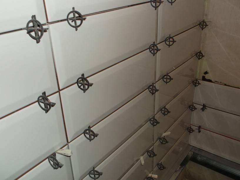 Раствор должен наноситься равномерно, не допуская пустот под кафелем. На стыках плитки нужно обязательно использовать клинки. Это могут быть специальные крестики, зубочистки, спички. Крестики нужны для того, чтобы расстояние между плитками на стене было одинаковым. Облицовку мозаичными и крупноформатными плитками стараются делать без стыковочных швов.