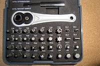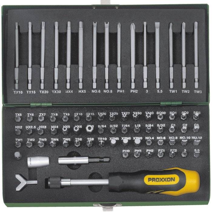 Как правило, она входит в комплект, простейший из которых состоит из специальной рукоятки и набора различных бит (наконечников).