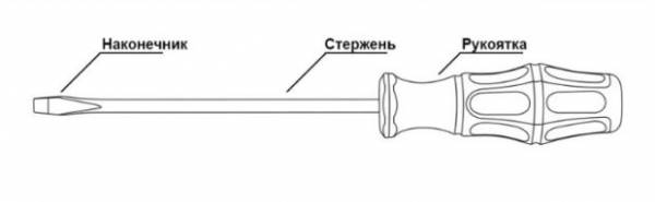 Отвёртка представляет собой стержень с наконечником на одном конце, предназначенным под определенный вид шлица, и рукоятью на другом. Большое значение имеет материал и размер рукоятки. Она может быть выполнена из пластмассы, дерева или резины. Форму рукояти необходимо выбирать в зависимости от размера ладони: подходящая вам рукоять будет удобно лежать в руке.