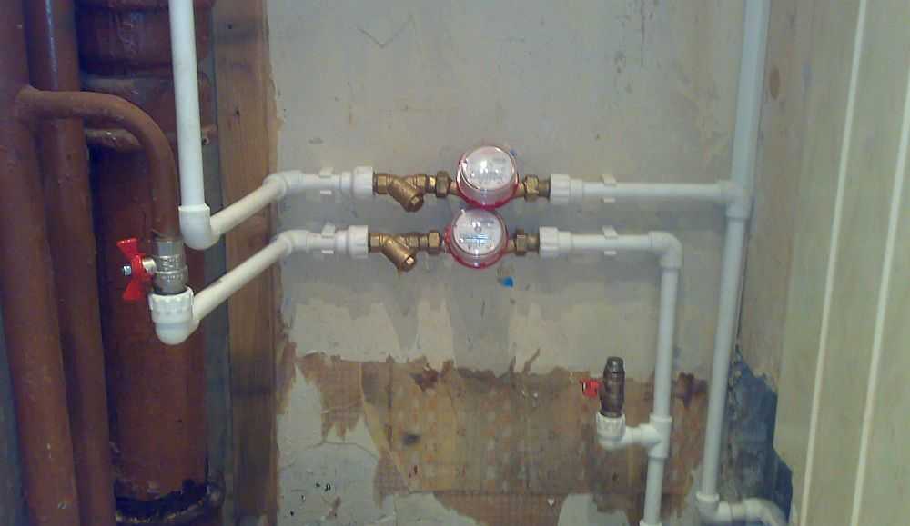 Для холодной и горячей воды нужны отдельные узлы счетчиков. Крайне желательно, чтобы счетчики и рукояти вентилей были выделены цветом. Показания счетчиков должны быть ясно читаемы без каких-либо дополнительных операций (съем люка и т.п.), поэтому часто приходится заранее собирать часть цельного трубопровода, иногда довольно причудливой конфигурации, для подключения приборов учета к стояку. Помимо труб и паяльника для этого понадобятся переходные муфты с пластика на металл МРВ – муфта резьбовая внутренняя. Пластик же к узлам учета подключается при помощи МРН – муфт резьбовых наружных.