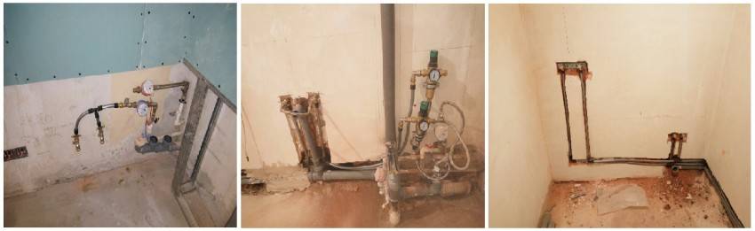 - Если основные трубы располагаются внизу над полом, водопроводные отводы через тройники, нужно провести перпендикулярно вверх.