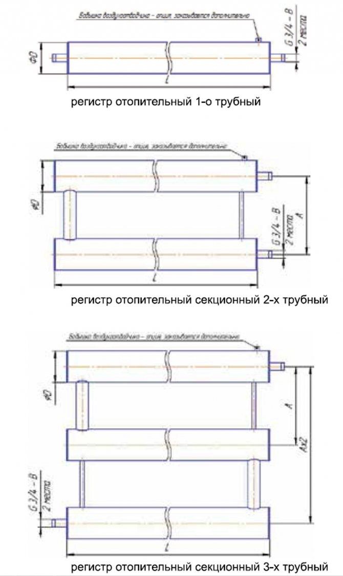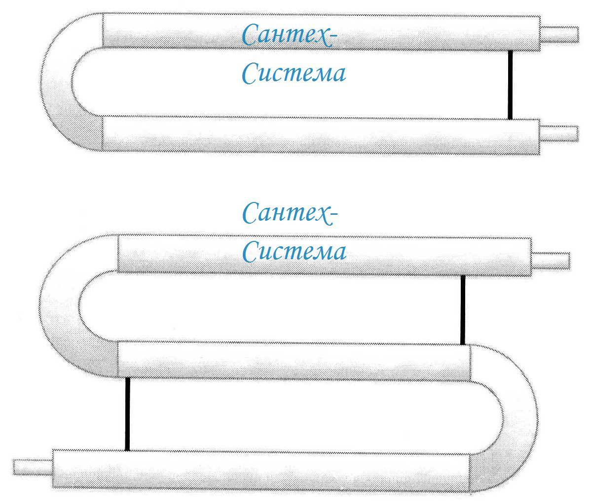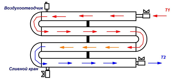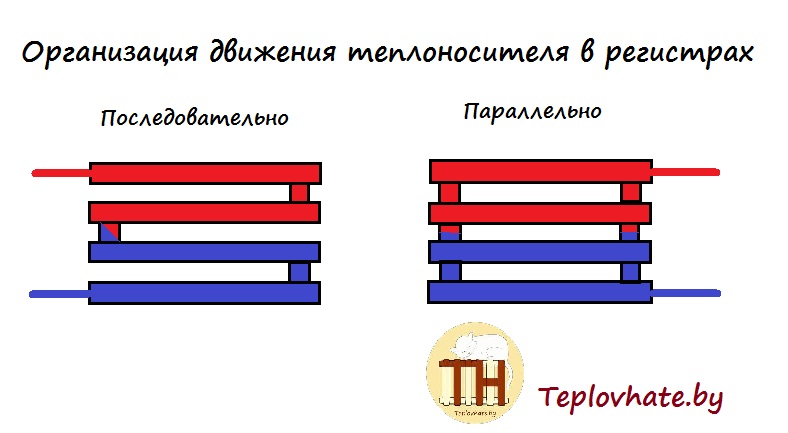 Первый вариант встречается крайне редко, в основном все делают регистры водяного отопления из нескольких параллельных отрезков, которые находятся в горизонтальной плоскости. Чтобы в регистре осуществлялась циркуляция, горизонтальные отрезки соединяются между собой переливными патрубками: