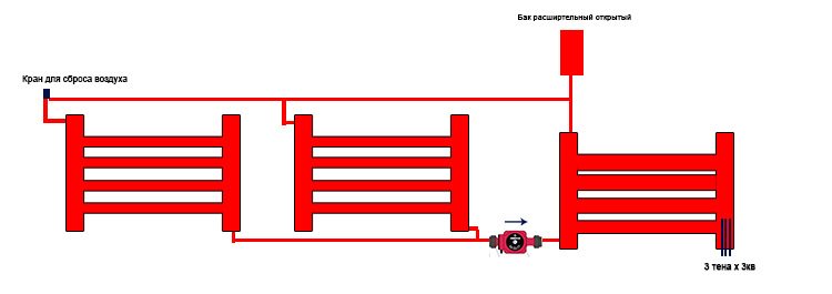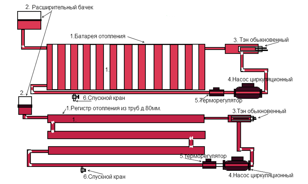 Если любой регситр вставить ТЭН, можно получить комбинированный отопительный прибор. Он может быть отдельным, не связанным с системой, или использоваться как дополнительный источник тепла. Если радиатор будет изолированным с нагревом только от ТЭНа, необходимо в верхней точке поставить расширительный бачек (10% от общего объема теплоносителя). При нагреве от бытового котла расширительный бачок, как правило, встроен в конструкцию. Если его нет (часто бывает в твердотопливных котлах), то и в этом случае необходима установка расширительного бачка. Если материал для регистров сталь, то бачок нужен закртыого типа.