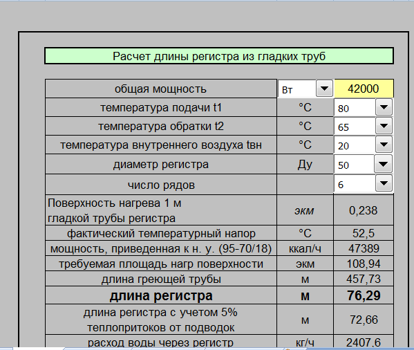 Расчет мощности регистра отопления заключается в том, чтобы подобрать необходимые габариты теплообменника. Это напрямую влияет на количество теплоносителя в нем и площадь теплообмена. Чем больше регистр – тем большее помещение он сможет нагреть.