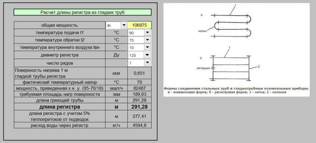 Для изготовления регистров применяются трубы с диаметром от 32 мм, допустим, именно они есть в наличие. Подставив значение в расчет, можно вычислить, что для обогрева такого помещения потребуется 7,1 метра. Эту величину можно разбивать на несколько отрезков. Получается, что расчет количества регистров отопления сводится к тому, чтобы узнать общую длину труб с заданным диаметром, а потом разбить ее на удобные отрезки.