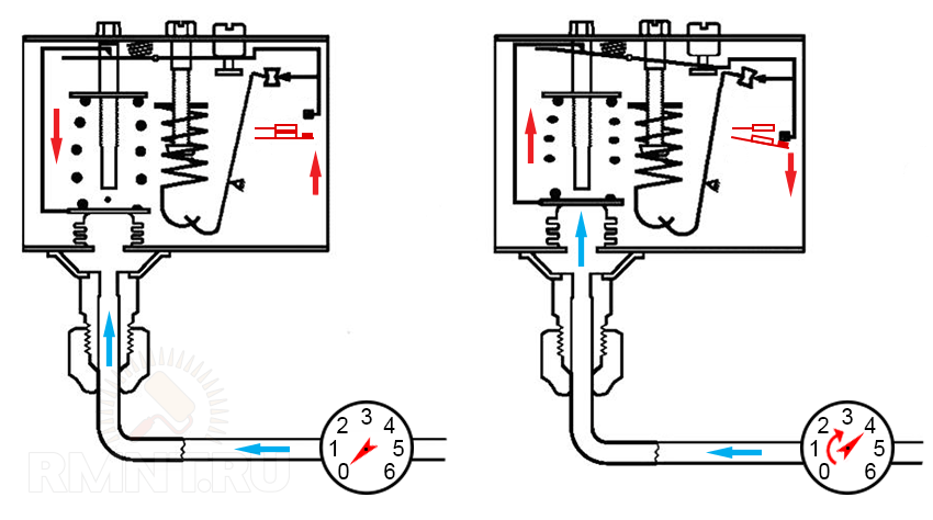 Реле устроено на принципе размыкания контактной группы при изменении напора воды. Оно непосредственно соединяется с насосом с помощью выходных контактов. На схеме, представленной ниже, показаны основные узлы устройства реле подачи давления воды.