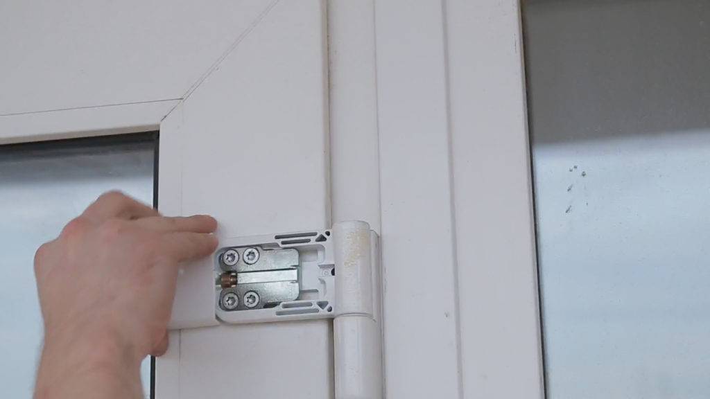 Кроме того, можно отрегулировать пластиковую дверь балкона не только со стороны петель и эксцентриков, но и откорректировать прижим со стороны откидного механизма.